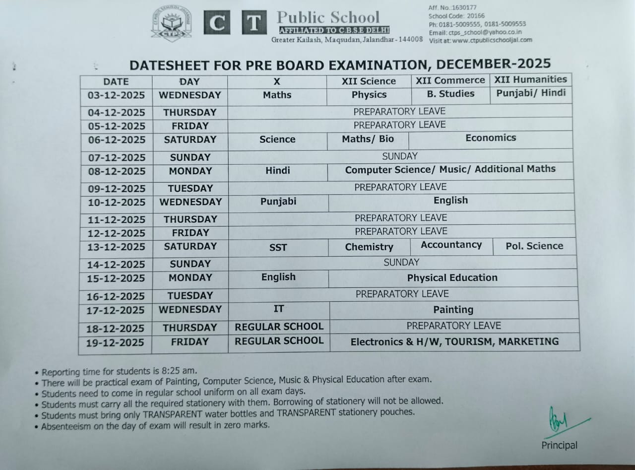 DATESHEET FOR PRE BAORD EXAMINATION,DECEMBER 2025