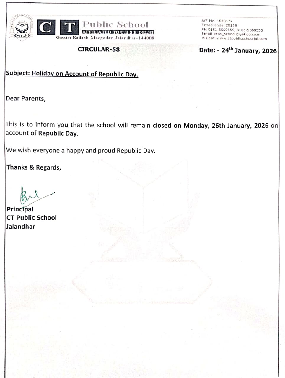 Holiday on account of Republic day